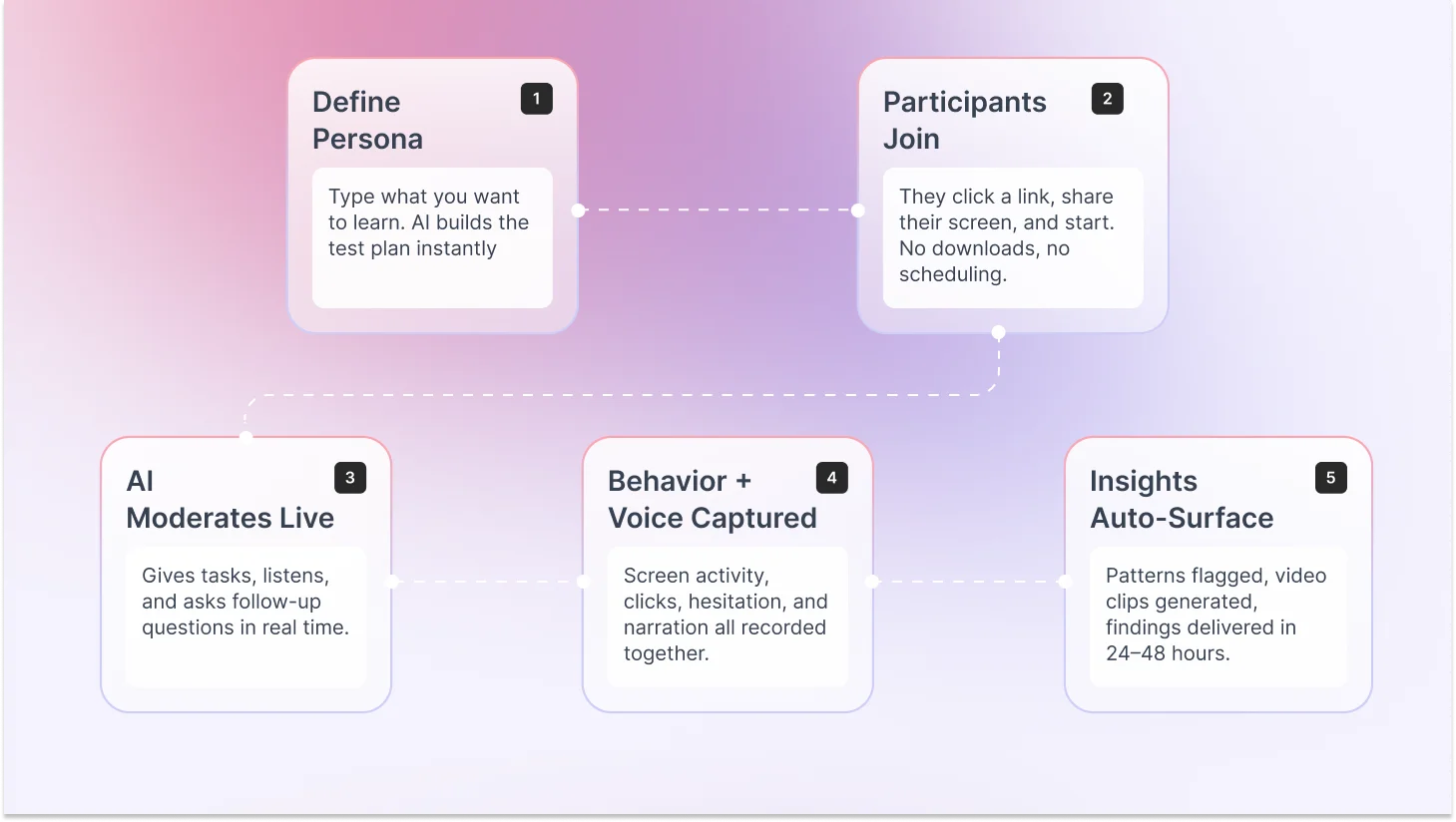 Most product teams believe in user testing. They just can't make it fit because the traditional process is too slow, too expensive, and too dependent on research bandwidth to run at the pace modern product development requires.
