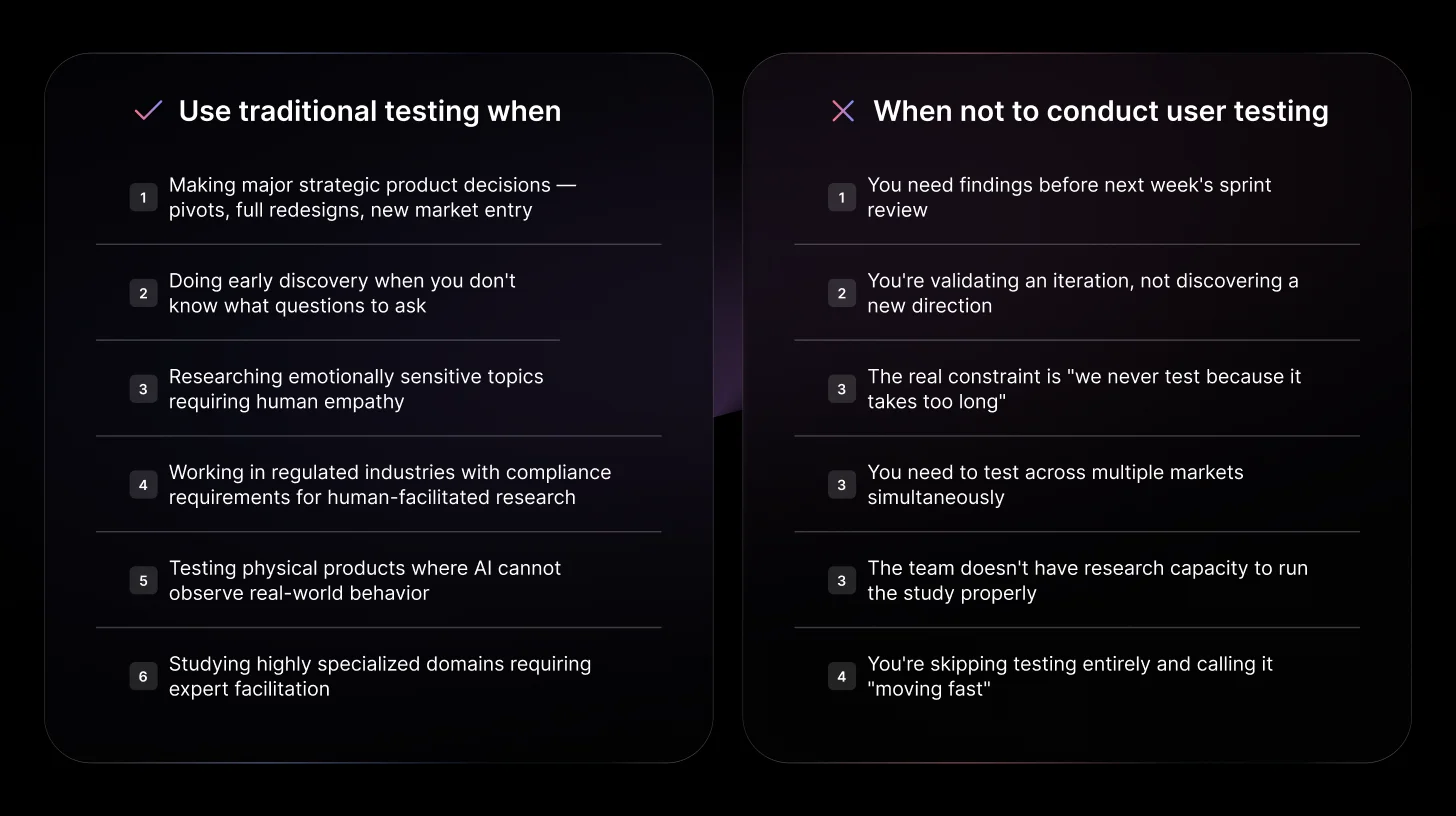 AI user testing now wins for speed, scale, and continuous product development. Traditional testing still wins in high-depth, exploratory research where human judgment is critical.