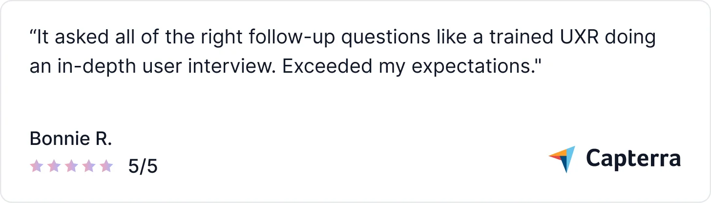 - AI Moderated Interviews: Conducts dynamic, one-on-one interviews with users, asking follow-up questions and adapting in real time.