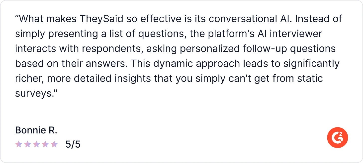 - AI-Moderated Interviews: Deep qualitative interviews at scale. AI probes pain points, skips irrelevant questions, adapts to each respondent. Great for churn research & win/loss analysis.