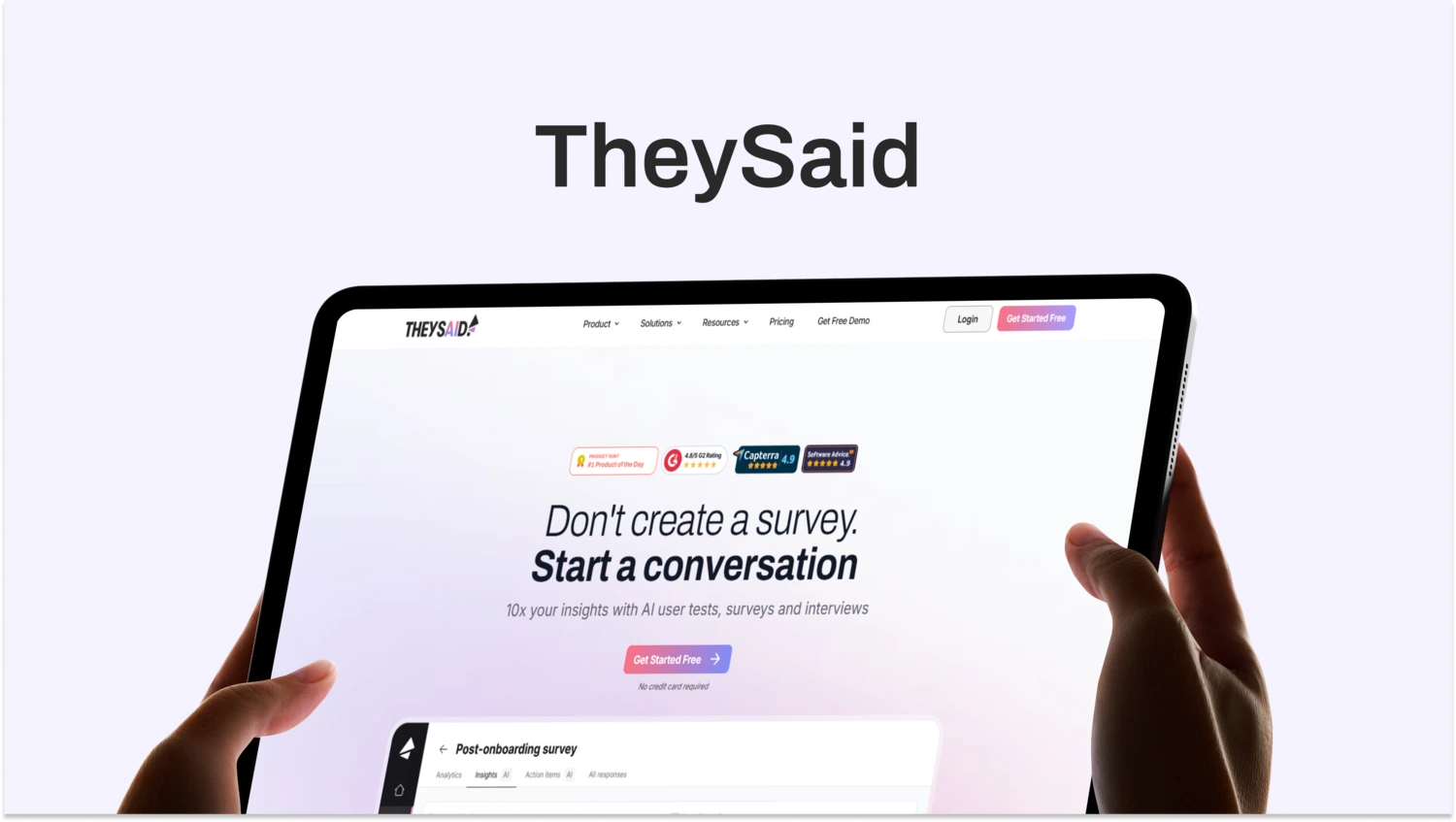 TheySaid stands out because it’s built for this exact stage. By combining surveys, interviews, forms, polls, pulses, usability testing, and AI-driven analysis in one platform, it helps teams move from raw feedback to clear themes and decisions without relying on manual work or disconnected tools. Product, CX, UX research, customer success, HR, and leadership teams can all work from the same insights, in real time.