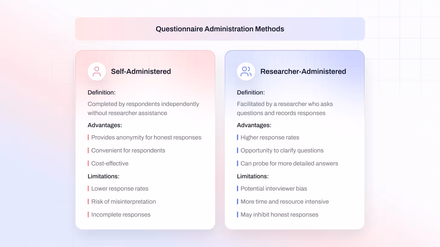 Questionnaires can also be grouped by how they are delivered and completed, which can affect response rates and the types of data you collect.