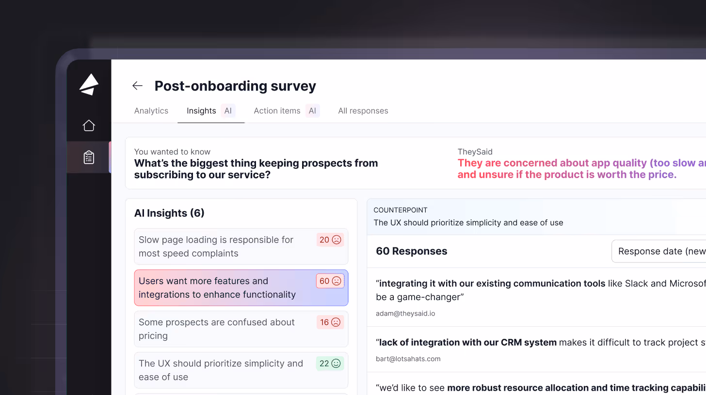 TheySaid does the hard work for you. It creates AI-powered, conversational surveys, follows up on vague responses to get deeper insights, and provides smart analysis so you know exactly where to improve without drowning in data.
