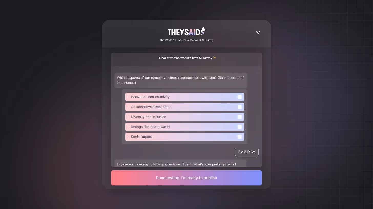 The type of questions you choose will directly affect the quality and depth of your data. With TheySaid, you can mix question types seamlessly and even let AI suggest follow-ups to get richer, more meaningful responses.