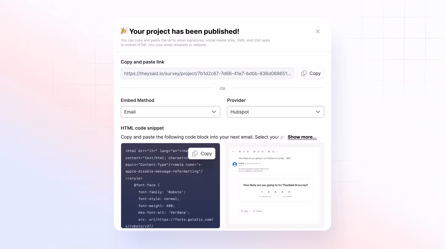 Modern tools like TheySaid allow you to add AI-assisted logic, branching, and follow-up questions automatically. This creates a personalized experience for respondents, improves completion rates, and generates deeper insights.
