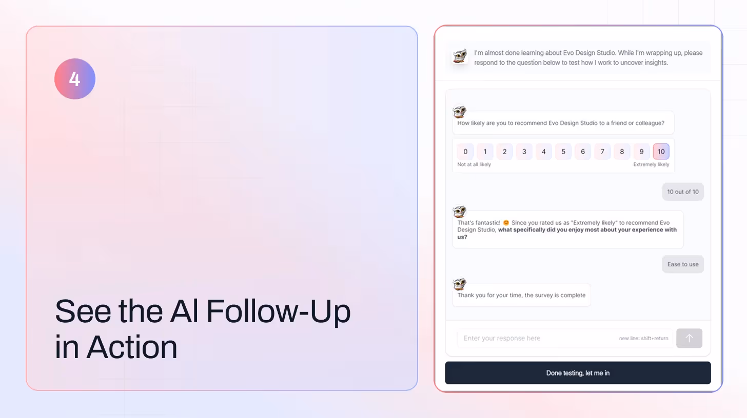 - Let AI handle follow-up questions - Conversational flow reveals insights static surveys miss