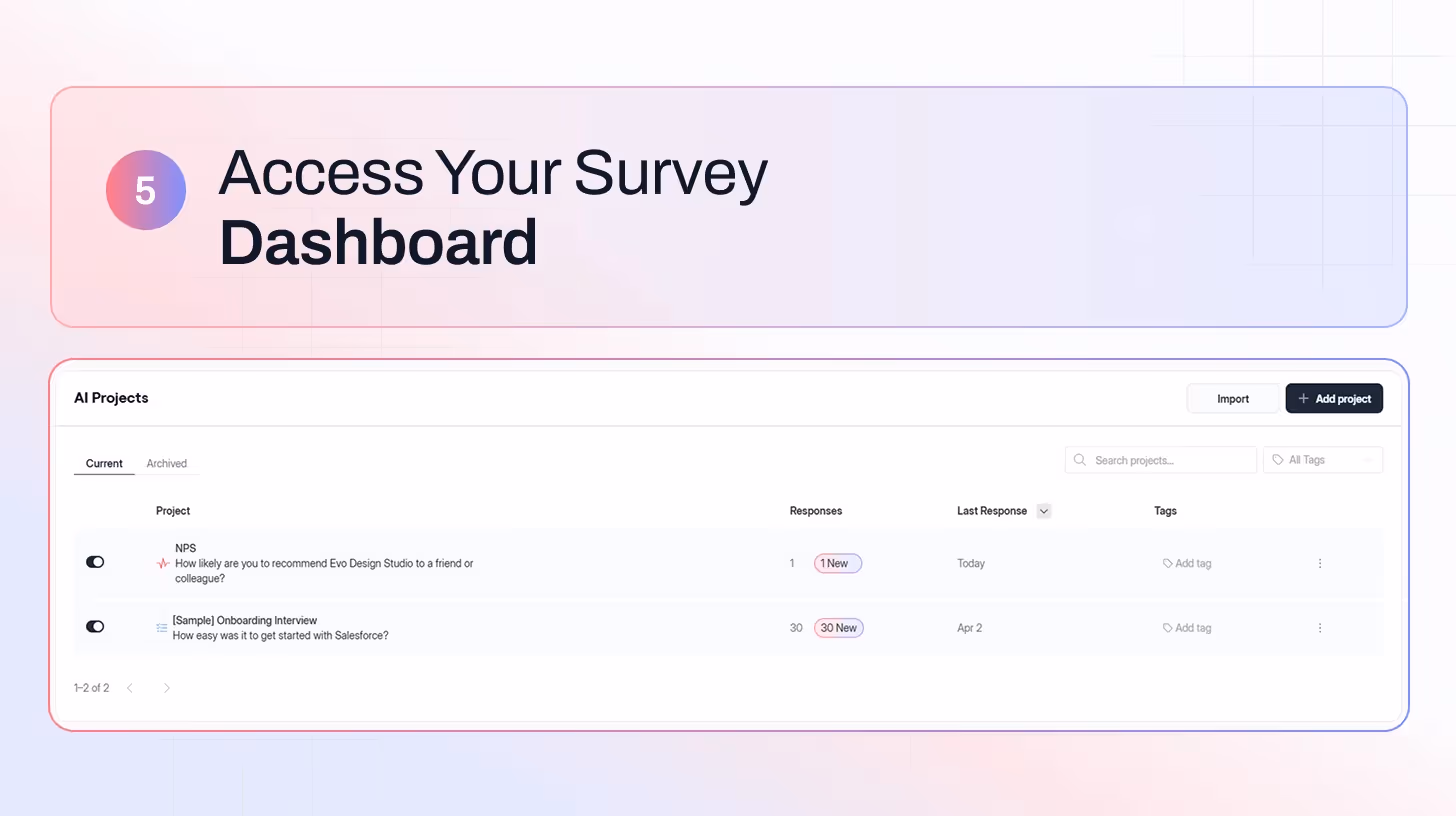The dashboard makes it easy to manage multiple surveys. You can search for specific projects, filter by tags, view archived surveys, or import existing data. When you're ready to create your first real survey, just click the "+ Add project" button.