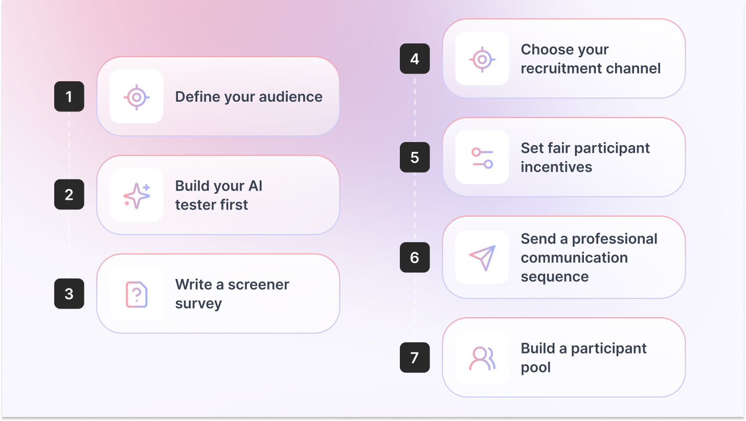 - Never rely on a single channel: The best research teams layer channels. Start with AI testers to validate the study, recruit core participants from the panel or customer base, and supplement with LinkedIn or community outreach for hard-to-reach profiles.