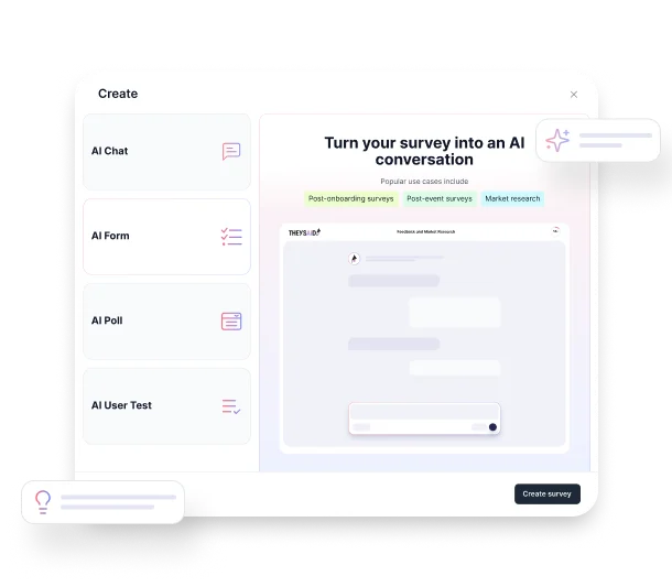 Generate appropriate feedback programs for different scenarios—employee feedback, customer research, user testing, or market studies. AI adapts question style and format to your specific audience and goals, delivering AI productivity gains across all research types.