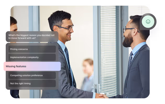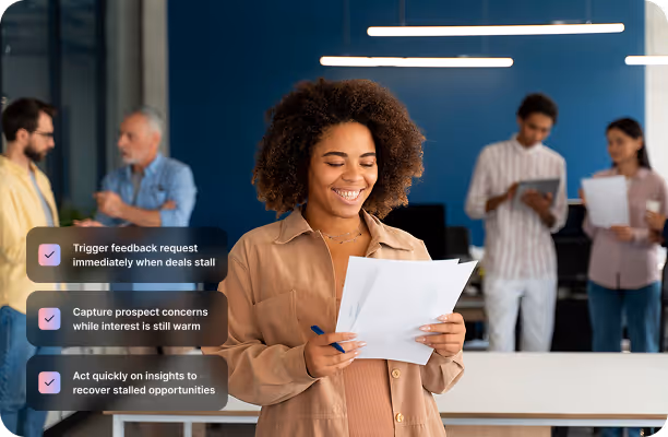 Trigger feedback collection immediately when opportunities stall, capturing prospect concerns while relationships are still warm and recovery is possible.