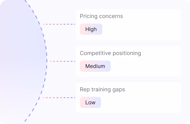 AI detects patterns across lost prospects—revealing whether problems stem from competitive positioning, pricing strategy, rep training needs, or solution gaps.